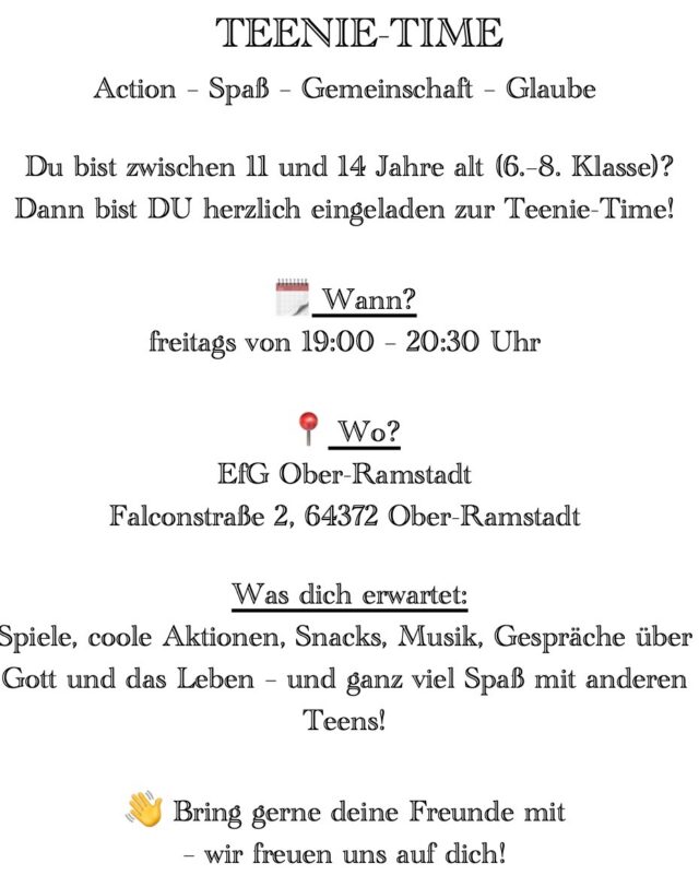 Jugend Teenie Time 🔹 23. Januar 🔹 13. Februar 🔹 27. Februar 🔹 13. März 🔹 27. März 🔹 17. April 🔹 08. Mai 🔹 22. Mai 🔹 12. Juni 🔹 26. Juni